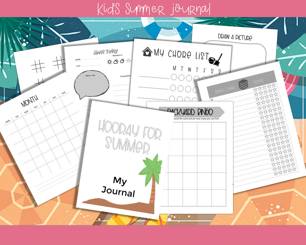 Our Kid's Summer Journal consists of several templates for children to record all of the highlights of their summer break. You can use this template pack to create multiple journals or notebooks. Or you can easily create printables to sell on your blog, website, or Etsy.Â